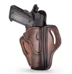 This 1911 Belt Holster is best fitted for 1911's without rails. It offers retention with barrel lengths from 4" to longer. Additionally, the sweat guard will protect your gun from tarnishing and will act as a comfortable barrier between you and your hammer preventing any gouging into your side. When wearing this outside-the-waistband belt holster you will find it holds your gun tight to your body offering reliable and comfortable carrying all day long. Features and open top design for quick draw, multi-fit design with reinforced stitching that's handcrafted to accommodate a wide range of firearms. Includes a strong beveled steel clip for comfort and the safest retention.