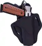 This 1911 Belt Holster is best fitted for 1911's without rails. It offers retention with barrel lengths from 4" to longer. Additionally, the sweat guard will protect your gun from tarnishing and will act as a comfortable barrier between you and your hammer preventing any gouging into your side. When wearing this outside-the-waistband belt holster you will find it holds your gun tight to your body offering reliable and comfortable carrying all day long. Features and open top design for quick draw, multi-fit design with reinforced stitching that's handcrafted to accommodate a wide range of firearms. Includes a strong beveled steel clip for comfort and the safest retention.