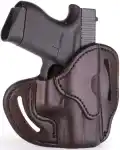 This Open Top Belt Holster Compact is designed to support the Glock 43. The Belt Holster Compact offers retention for comfortable and reliable all-day carrying. Features and open top design for quick draw, multi-fit design with reinforced stitching that's handcrafted to accommodate a wide range of firearms. Includes a strong beveled steel clip for comfort and the safest retention.