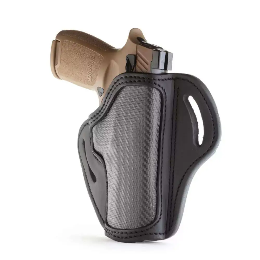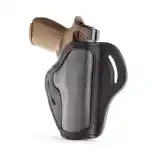 This Open Top Belt Holster Compact is designed to support the Glock 43. The Belt Holster Compact offers retention for comfortable and reliable all-day carrying. Features and open top design for quick draw, multi-fit design with reinforced stitching that's handcrafted to accommodate a wide range of firearms. Includes a strong beveled steel clip for comfort and the safest retention.