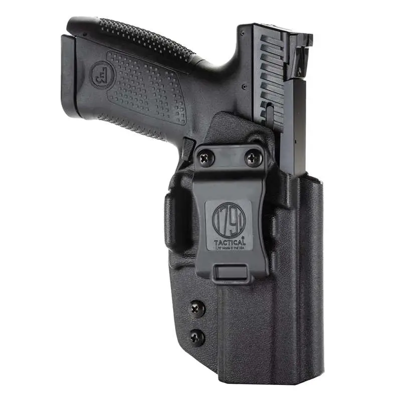 1791 Tactical Kydex IWB holsters represent a comfortable and dependable solution for everyday concealed carry. The lightweight, slim design combines multiple features for a customized, multi-position fit. In addition to being designed to fit threaded barrels, optics, and raised iron sights, it offers an adjustable cant, adjustable retention, and an integrated concealment wing that increases comfort and concealability. Also, the intelligent design, predicated on the actual firearm dimensions to create a snug true-fit, provides great retention which, unlike many Kydex holsters, will not harshly rub the finish of the firearm.