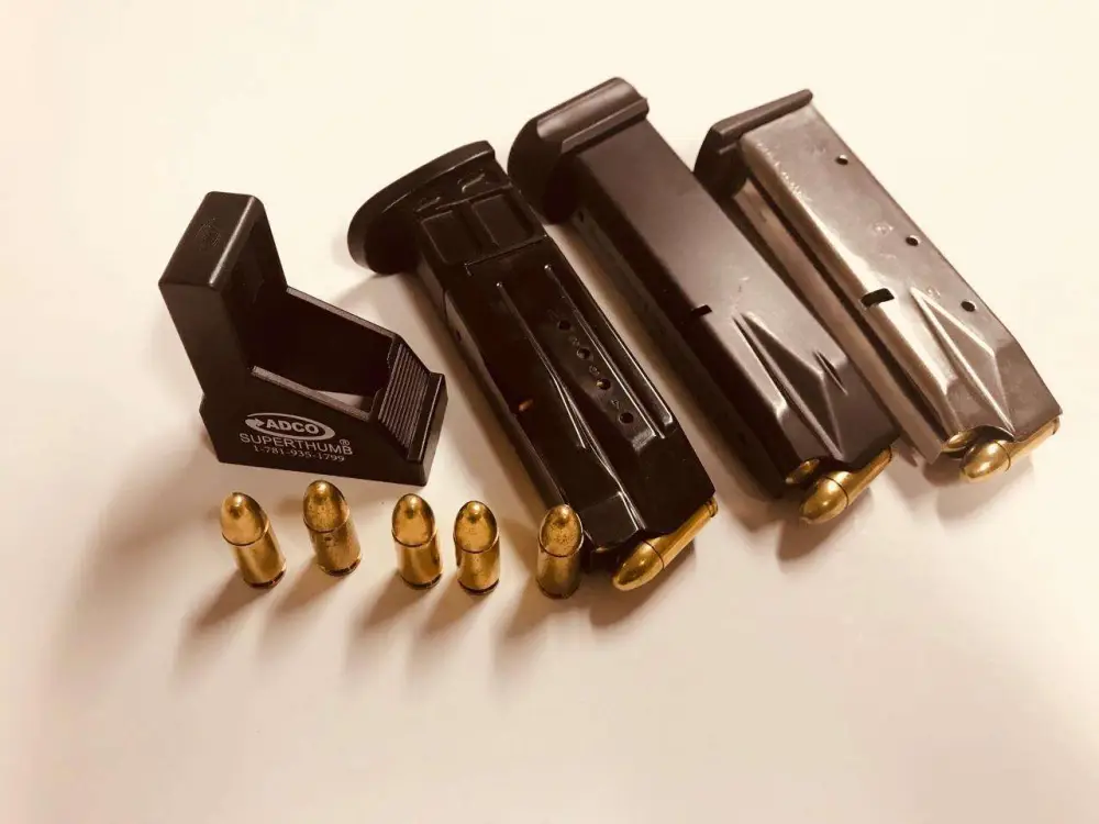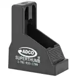 The Super Thumb ST1 magazine loading tool fits most double stack magazines, including: Astra A80/A90; Beretta Px4/92/96/Cougar 8000/8040; Bersa Ultra Compact Pro 9/40/45; Browning Hi Power; Colt 2000/Gov't model; CZ 75; FNP 9; HK USP; IMI Baby Eagle; IWI Jericho; Kel-Tec 9/40; SCCY 9mm; Sig Sauer 226/228/320; S&W 59/Sigma/M&P 9/40; Springfield XDS/XDM/XD40; Star 28/30/31; Steyr Mod. M/Mod. 9; Taurus PT92/111/917; Ruger SR9; Walther P99. The Super Thumb ST1 measures 21.5mm x 32.5mm.