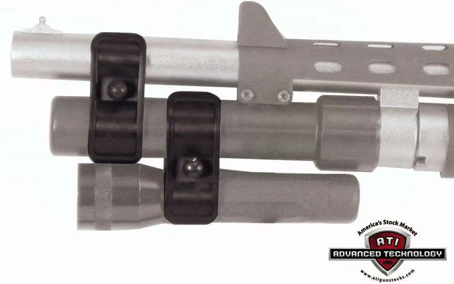 This clamp from ATI strengthens the connection of the magazine extension to the barrel. It may also be used to mount a 1" diameter light or laser to the barrel. A sling swivel stud is included and is reversible for right or left-handed shooters. The clamp is made of an extreme temperature, glass-reinforced polymer and fits all 12-gauge shotguns.