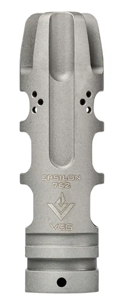 The VG6 Precision EPSILON 762 is a high performance muzzle brake for eliminating recoil. Compatible with most common .30 caliber chambered rifles, this hybrid device features both recoil compensation and flash signature mitigation in one package. With a continued focus on improved recoil control, the EPSILON 762 features a new enhanced chamber design that improves gas flow and felt recoil measurably over previous versions. We have also focused on saving weight through both the chamber design and aggressively cut channels along the length of the device. Following the success of the GAMMA 762, the EPSILON 762 provides an additional offering with distinguishable features for the growing M5/AR10/.308 platform.