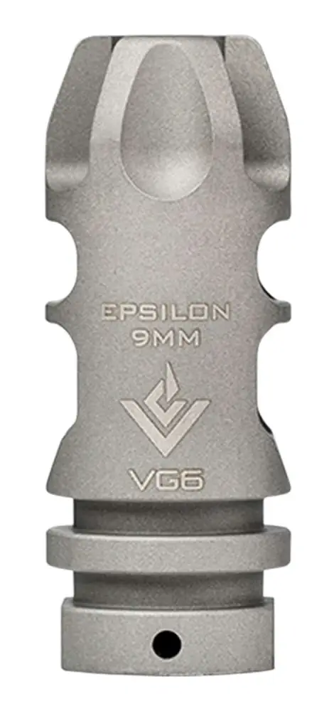 The VG6 EPSILON 9mm sets a new standard when it comes to recoil management by virtually eliminating any muzzle movement. This combination muzzle brake/compensator/flash hider is matched only by the amazing look of this device. Three extended flash hiding prongs help minimize muzzle flash providing the operator an uninhibited view through optics or sights while porting design has been optimized for the pressures of 9mm. We have created a muzzle device that produces very soft, low-energy recoil that allows for quick, precise follow-up shots.