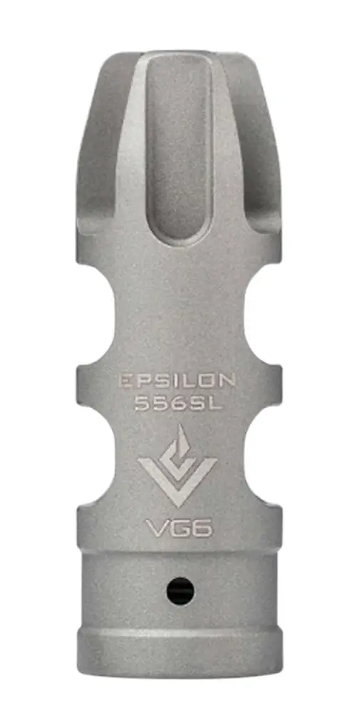 The EPSILON 556SL BBSS is the ideal muzzle brake for 14.5" rifle builds. Featuring an outside diameter of .745", the EPSILON 556SL can be pinned and welded to your barrel while still allowing full maintenance and removal of your gas block without having to remove the muzzle device. The EPSILON 556SL utilizes a new aggressive chamber design that improves gas flow and reduces felt recoil significantly. It also features deep channel cuts that greatly reduce the overall weight toward the front end of your build. Slim in design does not mean slim in performance. Users can still expect the same great performance they have grown to trust from VG6 Precision muzzle brakes. NOTE: The CAGE Device is NOT compatible with the Epsilon 556SL.
