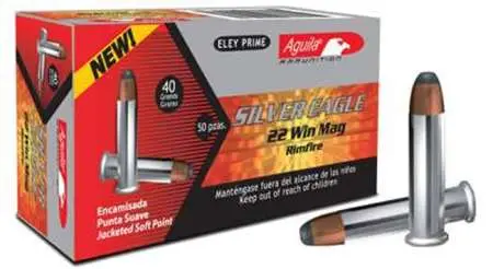 Aguila's Silver Eagle is used for controlling varmints at medium range with a bolt-action hunting rifle. This accurate semi-jacketed soft point projectile has a blazing muzzle velocity of 1,875 feet per second.