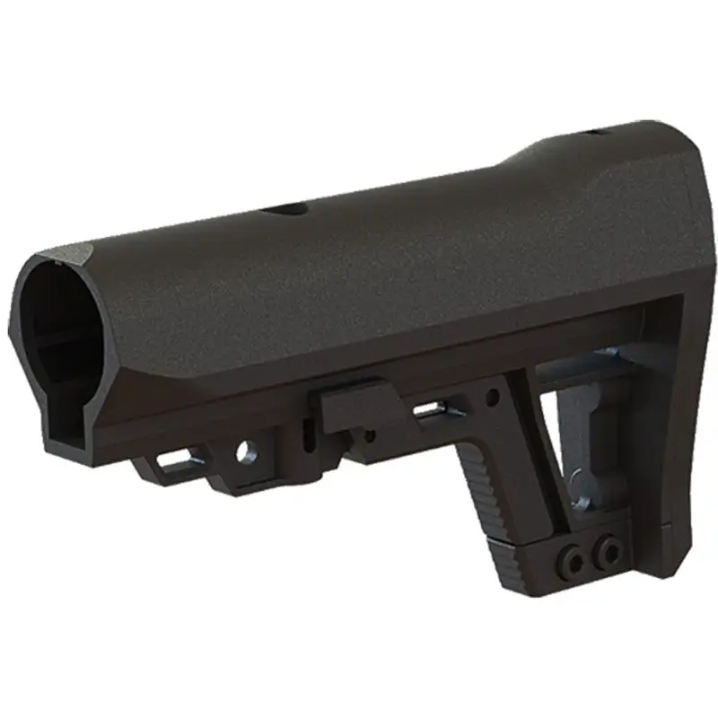 When we set out to design our own rifle stock, we knew it had to offer multiple configuration options right out of the box. We considered each way a person might need to shoulder their firearm, whether wearing gear or not and the range of adjustment that a person might need. We ended up with is a collapsible stock to 6 lengths while in the shooting position and engineered to be California compliant with the insertion of a single roll pin. Ambidextrous single Magpul QD sling mount attachment point, two standard sling attachment points and removable lower portion allows for reduced size and weight or installation of optional metal strike plate.