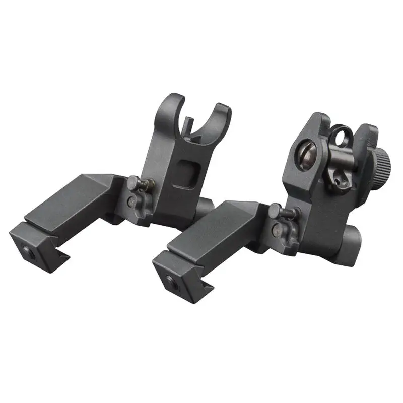 Aim Sports low profile 45 degree angled front & rear sight for use with standard AR-15. It is constructed of anodized aluminum with a ball bearing pivot detent, and mounts to standard Mil-Spec 1913 Picatinny rail. The flip-up standard A2-style front and A2-style dual aperture rear sights automatically locks into position when raised to the shooting position.
