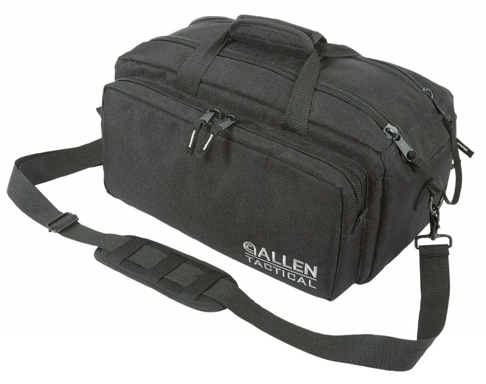The Pride Six Deluxe Tactical Range Bag features a 17" x 8" x 8" main compartment, removable padded handgun pocket, two 16" x 7" x 2" external pockets, and an internal compartment dividers. It also has a web carry strap with shoulder gripper.