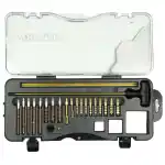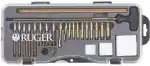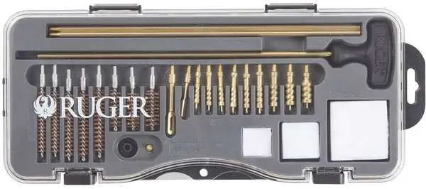 The Ruger Rifle/Handgun Cleaning Kit is packed in a molded toolbox and includes cleaning jags for .45, .40, .357/9mm, .30, .284/7mm, .270, .25, .243, and .22 caliber; bronze bore brushes for .45, .40, .357/9mm, .30, .270, .25, .243, and .22 caliber; heavy-duty brass cleaning rod; brass slotted tips for .22 and .30 caliber; brass adapter; 2" , 1.25", and .875" cotton cleaning patches; and a muzzle guard.