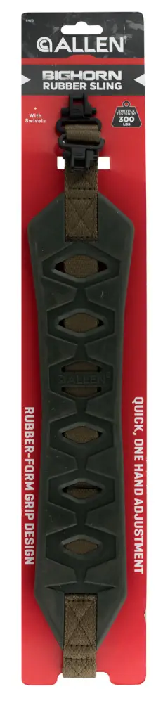 Allen's Big Horn Sling is constructed of lightweight rubber and heavy-duty web material to get you and your gun where you need to go. The rubber-form grip ensures that your sling won't slip while on your shoulder. The sling body is 14" long and 2.75" wide in the center, and the adjustable web sling extends up to 39" total length. Includes swivels tested to 300 pounds.