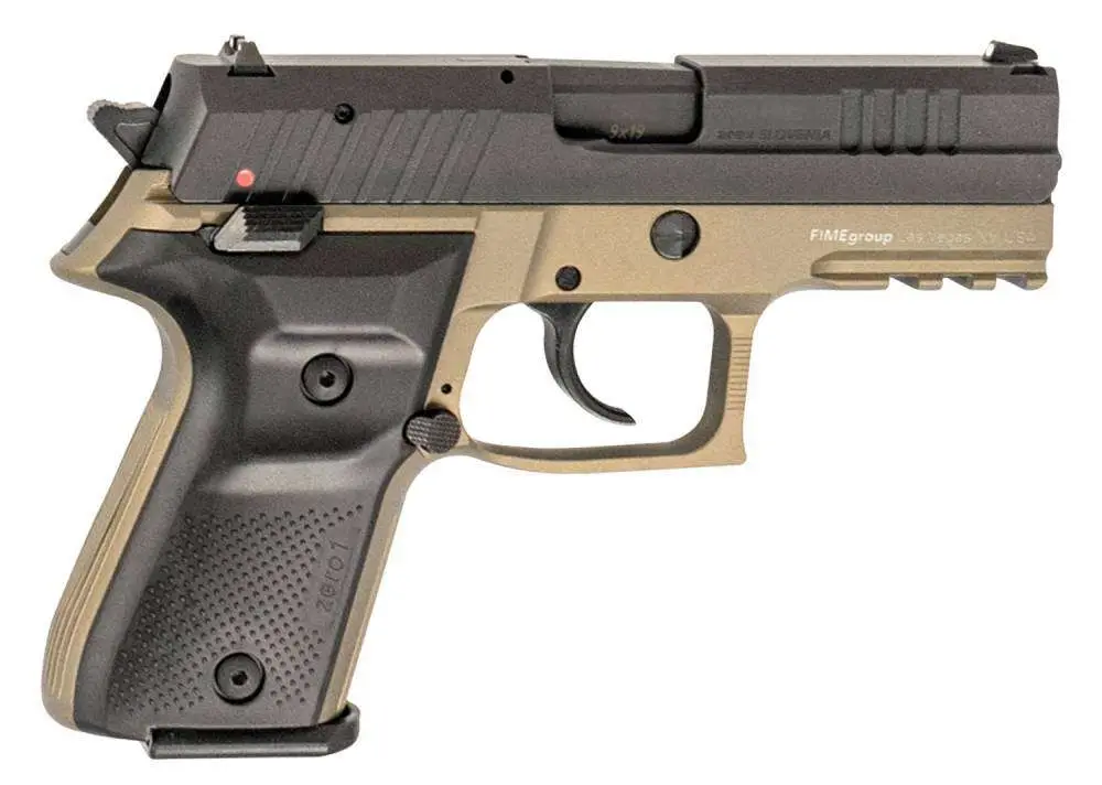 Arex's Rex Zero 1 pistol complies with strict military standards for reliability. Its frame is constructed of T7075 aluminum with steel locking block inserts and a hardcoat anodized finish. The nitrocarburized slide and cold hammer forged barrel are made from solid steel. The Rex Zero 1 has high profile white dot sights, ambidextrous safety, loaded chamber indicator, full length slide rails, and a large trigger guard for the use of gloves. This compact size model has an FDE frame with black polymer grips and a black slide. It has a 15-round magazine capacity.