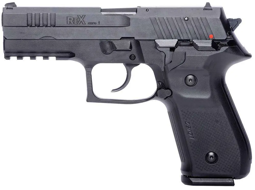 Arex's Rex Zero 1 pistol complies with strict military standards for reliability. Its frame is constructed of T7075 aluminum with steel locking block inserts and a hardcoat anodized finish. The nitrocarburized slide and cold hammer forged barrel are made from solid steel. The Rex Zero 1 has high profile white dot sights, ambidextrous safety, loaded chamber indicator, full length slide rails, and a large trigger guard for the use of gloves. This standard size model has a black finish and a 17-round magazine capacity.