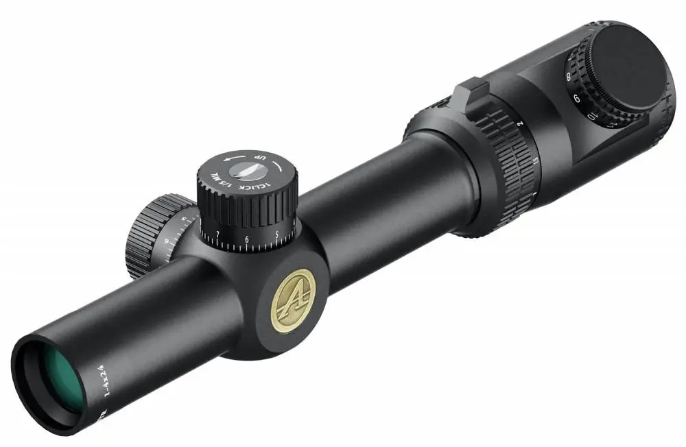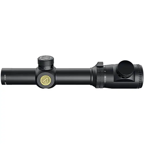 This Talos BTR 1-4x24 model has a AHSR14 second focal plane illuminated Mil reticle, a black matte finish, and a aircraft aluminum body.