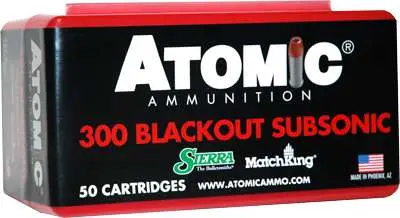 Atomic's 300 Blackout Subsonic Match Grade ammunition features a hollow point boatatil bullet and has low recoil.
