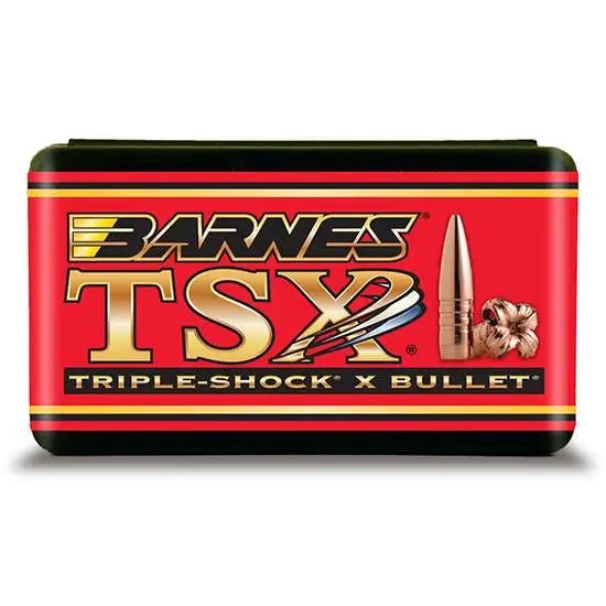 Barnes' TSX (Triple-Shock X) Bullet features include all-copper construction, no fragmentation, 28% deeper penetration than lead core bullets, and maximum weight retention. The TSX bullet has multiple, precisely engineered rings cut into the bullet shank, acting as relief valves while the bullet travels down the bore which results in improved accuracy, reduced pressures (for higher velocity loads), and less copper fouling.