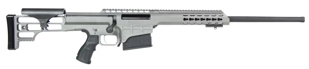 The Model 98B is entirely in a league of its own. This revolutionary precision rifle offers sub MOA long-range performance that others can only dream about. Its straight-line design, running from the highly efficient muzzle brake to the shooter's shoulder, tames recoil. It also allows for faster, more accurate follow-up shots fed from the 10-round detachable magazine. The ergonomic pistol grip reduces muscle fatigue and provides total control over the fully adjustable trigger. An intuitive, thumb-operated safety can be accessed without compromising the firing grip and allows the shooter to maintain a solid weld to the adjustable cheek piece. The oversized bolt handle can be easily manipulated, feeding a new round into the chamber as the bolt glides through a polymer guide. Its aluminum upper receiver boasts an M1913 optics rail, offering plenty of space to mount substantial optics as well as a night vision device or other accessories. The forward receiver is drilled and tapped for accessory rails to be mounted at the 3, 6 and 9 o'clock positions using KeyMod.