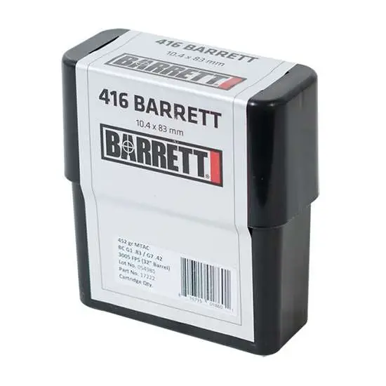 Barrett's match grade 416 ammunition is loaded with a 452 GR MTAC Cutting Edge Bullet, which has a much higher ballistic coefficient than their previous bullet. This change, combined with the consistency of Ruag brass and RWS primers, allows a shooter to have sub MOA performance capable of hitting targets well beyond 2500 yards, making it ideal for extreme long range shooting.