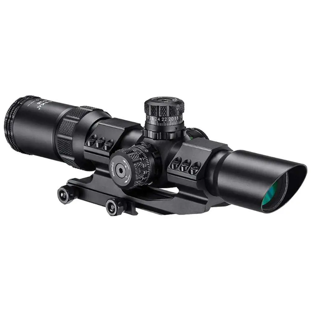 Barska's SWAT-AR IR has been specifically designed for tactical rifles such as the popular AR-15 platform, and the compact size and low profile make the SWAT-AR a great addition to any flattop AR-15 rifle. Included with the SWAT-AR riflescope is a 30mm cantilever scope mount, which places the SWAT-AR just forward of the rifles charging handle. The 1-4x zoom of the SWAT-AR makes it ideal for close to mid-range targeting, and the illuminated Mil-Dot reticle gives the shooter an advantage in low light situations. The shooter is able to switch between a red or green reticle and adjust the brightness to find the optimal reticle for the environment. The fully multi-coated optics of this scope series aims to provide the shooter with a sharp, clear image with great contrast. It also comes nitrogen purged and o-ring sealed for complete waterproof and fogproof protection. Other features include a external locking windage and elevation turrets and an angled sniper edge sunshade. The external locking turrets allow the user to quickly make adjustments to the scopes windage and elevation settings, and then have the ability to lock them into place to prevent any unintentional movement. The angled sniper edged sunshade significantly reduces glare and provides the user with a clearer view. Flip-up scope caps, cantilever ring mount, lens cloth and one CR2032 3V Lithuim battery are included.