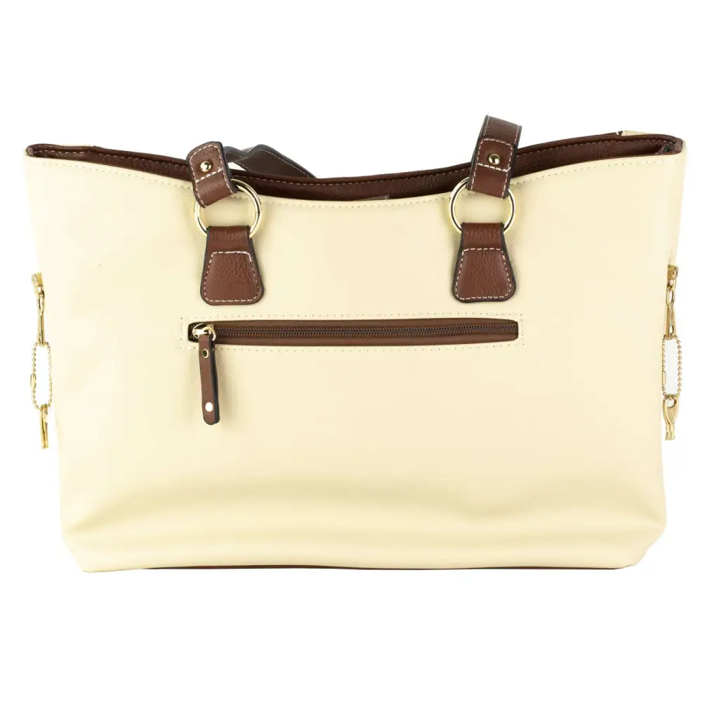 Bulldog's Tote style purse is designed to fit most small autos and revolvers. It features an universal fit, color matched holster and is made from durable leather. This purse's dimensions are 17" x 12" x 5" and has a sand/stone finish.