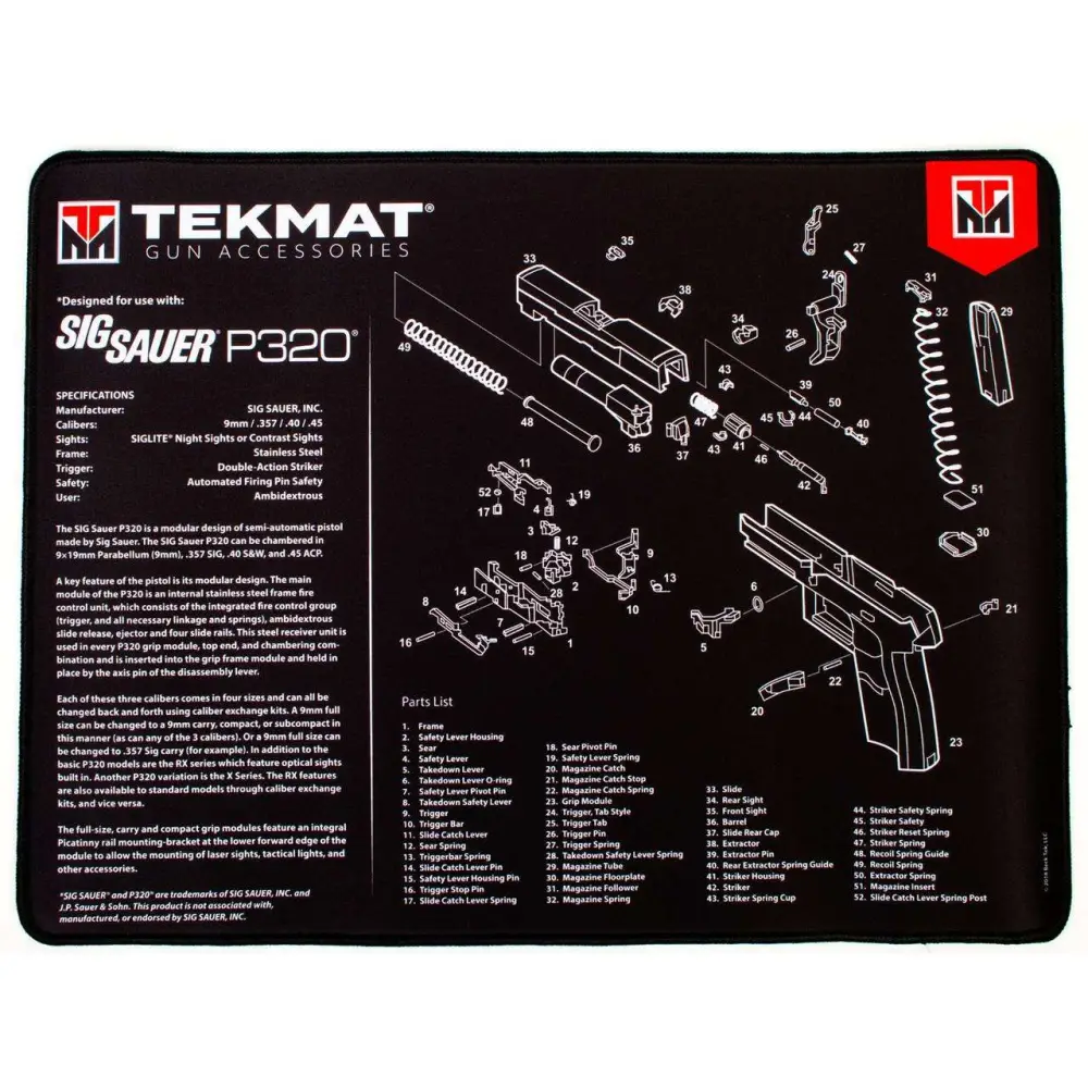 The Ultra 20 TekMat is large enough to handle a fully disassembled handgun with room to spare for tools and accessories. The extra thick .25 padding not only provides a premium feel and high level of quality but it offers extra protection from any rough handling or drops while working on your firearm. The ultra-soft, oil and water-resistant surface helps protect your firearm from scratches while the diagrams and illustrations help with cleaning, disassembly and are just plain fun to look at.