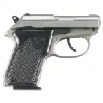 The 3032 Tomcat offers all the features of the 21 Bobcat, adding a wide slide and a contoured tang to protect the thumb web and increase pistol control. The snag-proof design and slide blade front sight permit quick presentation and fast target acquisition followed by smooth, crisp trigger pull in double/single action. The tip-up barrel allows direct chamber loading and safe clearing of the pistol. Jamming and stovepiping problems are virtually eliminated by the open slide design shared by all small frame Berettas. The Tomcat's barrel is forged from special high-strength steel; precisely rifled for accuracy. It has a black finish. The Inox Tomcat model has a stainless steel slide and barrel with an exceptionally corrosion-resistant and durable gray-anodized frame to match the color and finish of the stainless components. The trigger, hammer, safety, magazine and other metal parts are blued.