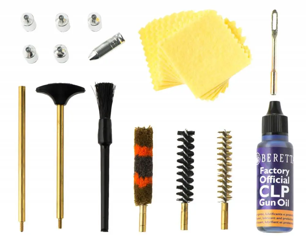 The Beretta Deluxe Pistol Cleaning Kit includes: a 3-piece brass cleaning rod with ergonomic anti-slip handle; one wool brush with iconic Beretta shoulder strap colors, brass brush, nylon brush and a brush with black handle; six (6) aluminum snap caps; cleaning patches; one bottle of factory official CLP gun oil.