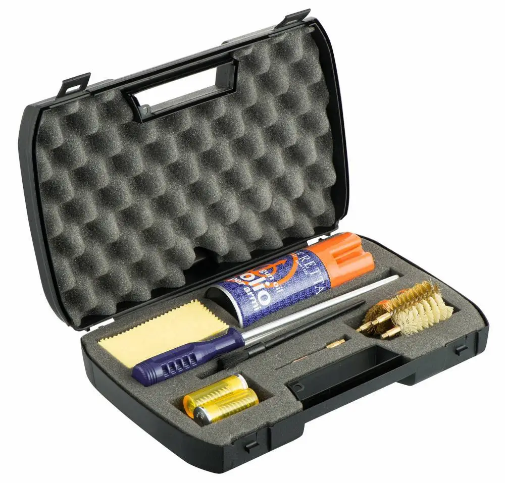 The Beretta Essential Shotgun Cleaning Kit includes: a full 3-piece aluminum rod with ergonomic and anti- slip handle; one wool brush with Beretta Iconic shoulder strap colors, brass brush, nylon brush, a brush with black handle; one loop cleaner rifle gauges; two plastic snap caps; cleaning patches; one bottle of spray gun oil.