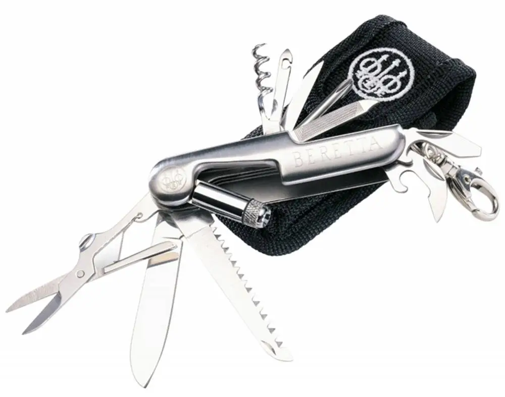 Beretta's Lighted Multi-Tool features a bright LED light is always at the ready. This pocket tool has it all: knife, saw, scissors, screwdriver/bottle opener, can opener, lanyard ring, corkscrew, small screwdriver, fingernail cleaner, leather punch, and #2 Phillips. Over the years, you'll appreciate the stainless steel scales, stainless steel liners and frame; plus the 420 C stainless steel blade. It comes in a fitted nylon belt sheath or can be clipped to pack, purse, or key ring with the spring clip. The LED light utilizes a V364 battery.