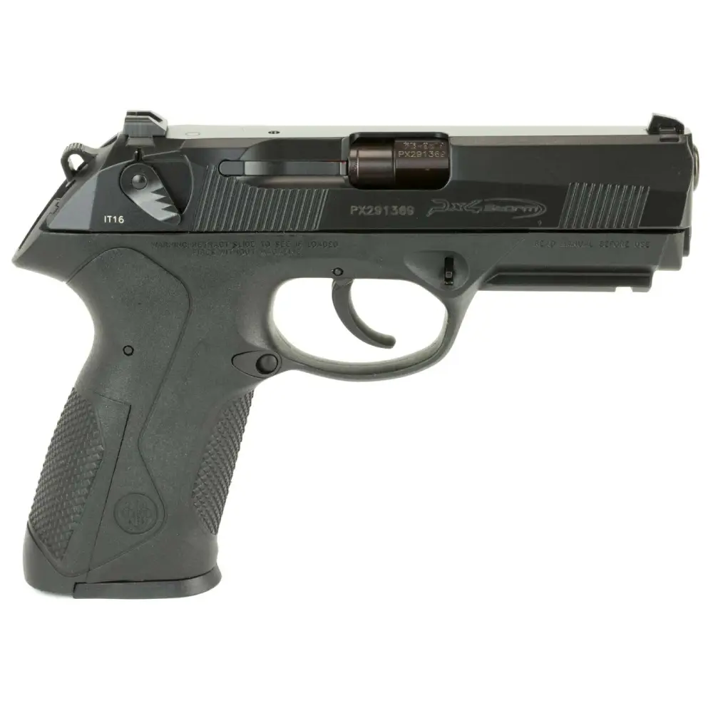 Beretta's Px4 Storm features an exclusive Beretta-designed locked breech with a rotating barrel system which reduces felt recoil and muzzle rise. The chrome-lined barrel provides extreme corrosion resistance and also features a deeply-recessed combat muzzle crown to protect the rifling. The light yet durable frame employs modern thermoplastic technology through the use of technopolymer-reinforced fiberglass and features an integral Picatinny MIL-STD rail. The Px4 Storm has an ambidextrous safety/decocking lever and a reversible magazine release, and it may be configured with a small, medium, or large backstrap for individual fit (3 backstraps included). The modular structure, ergonomics, and interchangeability of parts make the Px4 Storm the ideal firearm for law enforcement use and personal defense. This 9mm model comes with a 17-round magazine.