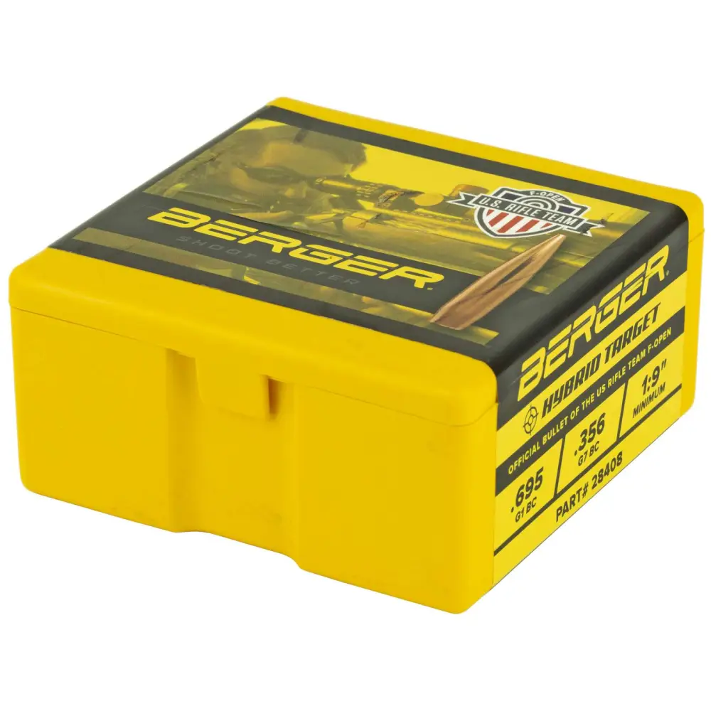 Berger Bullets was started because Walt Berger wanted better results while competing in target shooting matches. The Target bullet line is made up of match grade bullets used all over the world to set records, win matches and improve scores of target competition shooters. Using J4 precision jackets, they are the most balanced bullets made. This balance, combined with sleek designs of the VLD, Hybrid, or Long Range BT makes it easy to see why they are the most trusted bullet on the firing line. Flat Base provides the tightest possible accuracy at short ranges, capable of sub 1/4 MOA groups, with inherent stability. Boat Tail is made with a tangent ogive and is easy to shoot accurately. Long Range Boat Tail has an extra long tangent ogive for higher BC and is specifically designed for long range shooting. VLD has a long secant ogive for reduced drag and shoots flatter and is less affected by wind than other bullets. To keep performance high, target bullets are designed with thicker jackets that withstand more stress before bullet degradation occurs.
