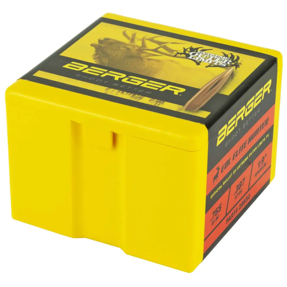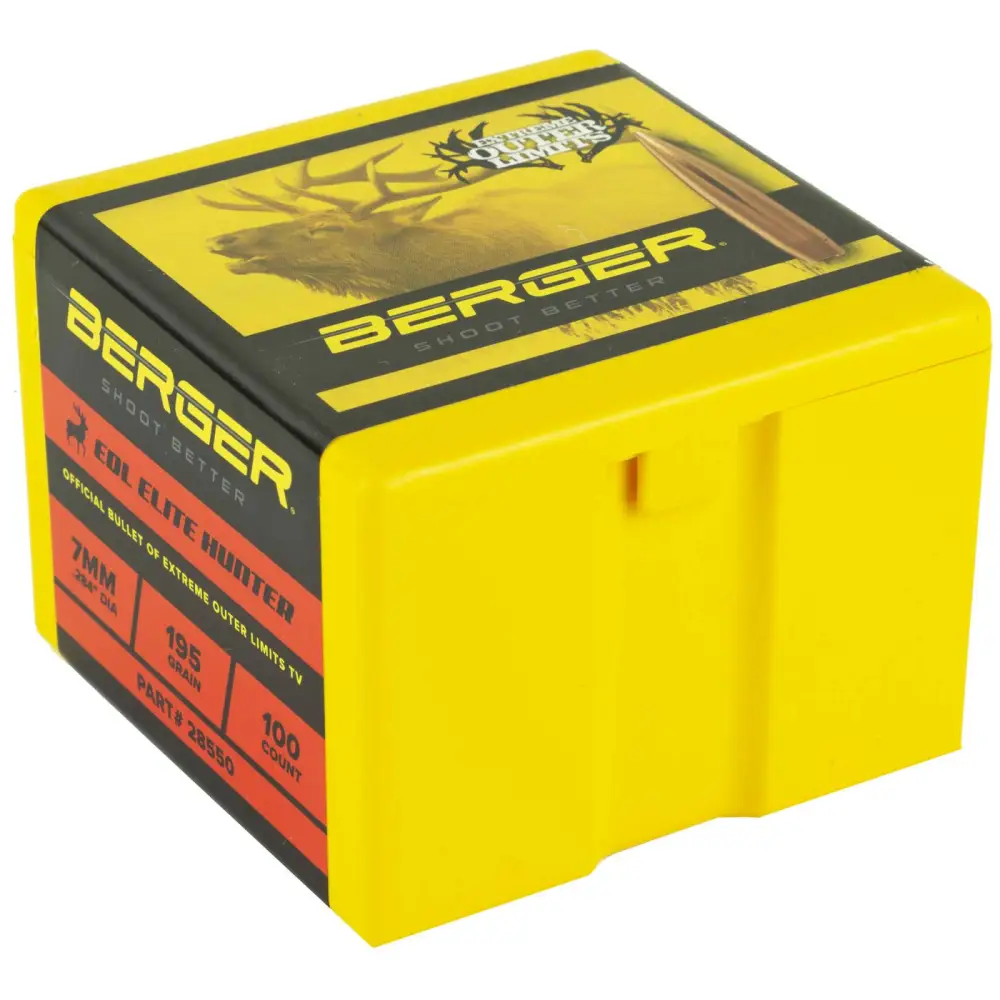 EOL Elite Hunters were developed through a partnership with Berger and Extreme Outer Limits TV. These bullets break the trend-line for today's heavy hunting bullets and are designed for extreme long range hunting situations, typically with custom rifle applications. Elite Hunter Bullets utilize Berger's industry-leading hybrid ogive, which blends tangent and secant designs to optimize efficiency, reduce wind-drift, and minimize sensitivity to seating depth. Elite Hunter Bullets are identical in construction, shape and performance to the Berger Hybrid Target series, except they utilize a thinner J4 Precision Jacket for rapid expansion on game animals. Elite Hunters are designed to penetrate 2-3 and then begin to expand and create a massive wound cavity up to 15. The hydrostatic shock causes most animals to drop immediately.