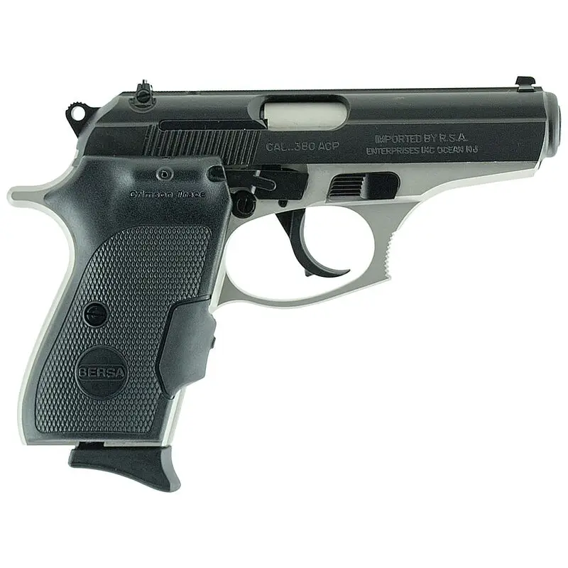 Bersa's Thunder 380 is ideal for personal protection and offers accuracy, reliability, versatility in a lightweight, compact design. Its aluminum alloy frame has a combat style trigger guard, integral locking system and decocker safety, and a micro-polished bore with sharp, deep rifling. The steel slide features a 3-dot sight system for the prefect sight picture. The Thunder 380 features an extended finger rest on the bottom of the magazine for comfort. This duotone model has a nickel finish frame with a matte black slide and black Crimson Trace Lasergrips with a red laser.
