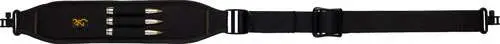 The All Season Black sling is padded and is non-slip textured. It features and elastic cartridge loops, thumb loop for comfort and easy adjustment, and metal sling swivels are included.