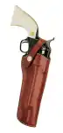 This high ride holster is designed for single action revolvers. Constructed of full grain cowhide, its clean lines offer an exposed trigger guard. The retention strap with front strap closure wraps securely behind the hammer. This high ride holster has an open muzzle and is suede lined with ivory stitching.