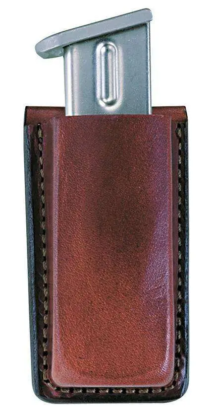 The Model 20A Open Top Magazine Pouch uses a heavy-duty spring steel clip to attach to the belt, securing it just outside the waistband. Quick and compact, this pouch puts magazines close at hand. It fits belts up to 1.75 in. (45 mm) and is constructed of full grain leather. This model has a tan finish and is compatible with Browning BDA 9/40; Colt Commander, Gold Cup, Government 1911; Detonics Combat Master .45; Kahr T40; Llama IXA; Ruger P90; S&W 1006, 1076, 1086, 4506, 4566, 5944; Sig P220, P225; Springfield TRP Operator; Star AS.