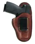 The Professional is an inside the waistband holster that meets the requirements for deep concealment. This design features a high back that provides a shield between the body and the sharp edges of the pistol. The belt clip provides easy on and off convenience, yet securely anchors the holster to the belt. It rides at an optimum angle inside the waistband to ensure proper firing grip on the draw. A heavy duty spring steel clip secures the holster to the waistband.