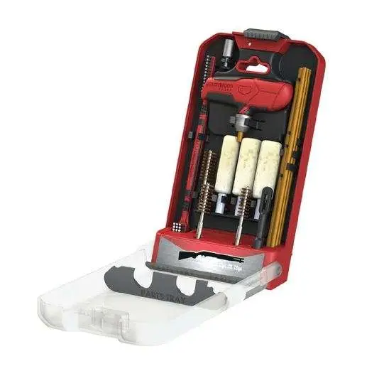 Birchwood's Universal Shotgun Cleaning Kit features a custom handle with locking chuck that is multi-functional, rotates, taps pins and can be used for detailing. Impact-resistant hard shell case includes kickstand to display tools for easy access.
