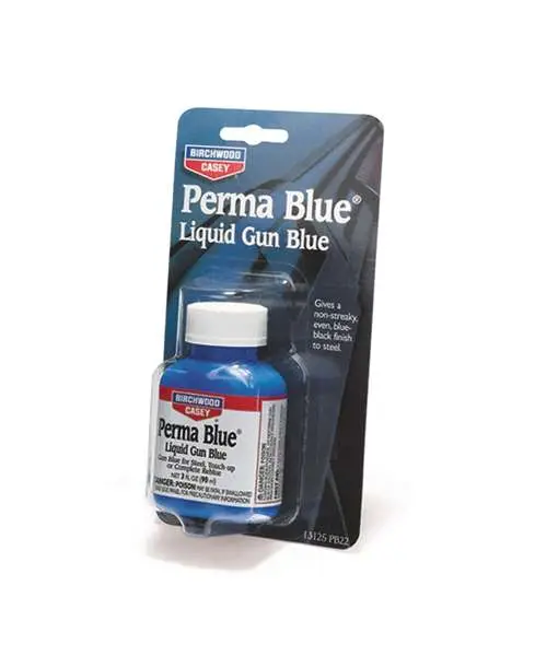 Birchwood Perma Blue Liquid Gun Blue is the best way to touch up scratches and worn spots or even completely reblue most guns. It will give a non-streaky, even blue-black finish to steel (except stainless). Perma Blue will not blue stainless steel, aluminum or non-ferrous metals.