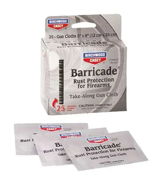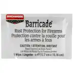 Birchwood Barricade Rust Protection Take-Alongs leave a lasting, protective, anti-rust film on firearms and other metal equipment. It rapidly drives out moisture from metal pores and deposits a transparent protective coating which seals the surface. It also loosens rusty or frozen parts and is handy to use as a bore cleaner/protector when run through gun bore. Comes in a easy to use packet.