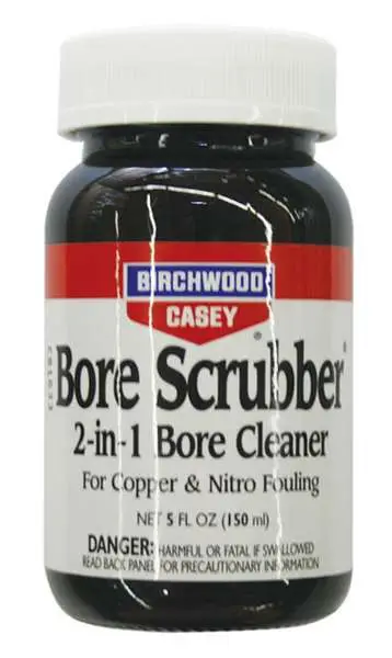 Birchwood's Bore Scrubber 2-in-1 Bore Cleaner quickly, easily and safely removes all types of fouling, carbon, powder, copper, lead and plastic wad residue. The solvent clings to and penetrates neglected or fouled bores. It contains no highly toxic ingredients and is safe for use on steel.