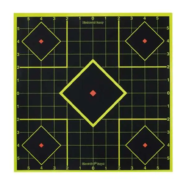 With Birchwood's Shoot-N-C Sight-In target bullet holes are revealed with bright chartreuse rings. Five targets on each sheet, use center target for sighting-in and four smaller targets for testing results of various ballistic loads or for confirmation of sight-in groups. The convenient 1" numbered grid lines simplify scope adjustments. Self adhesive backing makes targets easy to place. Great for indoor or outdoor use and low light conditions.
