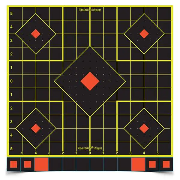With Birchwood's Shoot-N-C Sight-In target bullet holes are revealed with bright chartreuse rings. Five targets on each sheet, use center target for sighting-in and four smaller targets for testing results of various ballistic loads or for confirmation of sight-in groups. The convenient 1" numbered grid lines simplify scope adjustments. Self adhesive backing makes targets easy to place. Great for indoor or outdoor use and low light conditions.