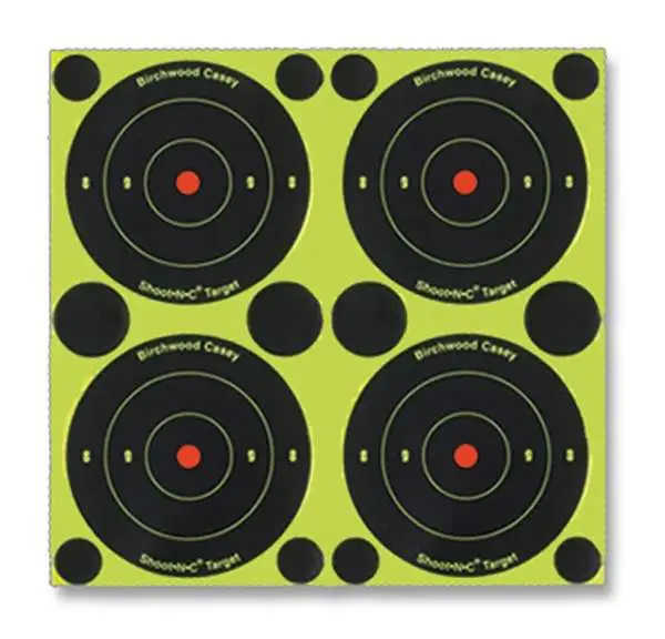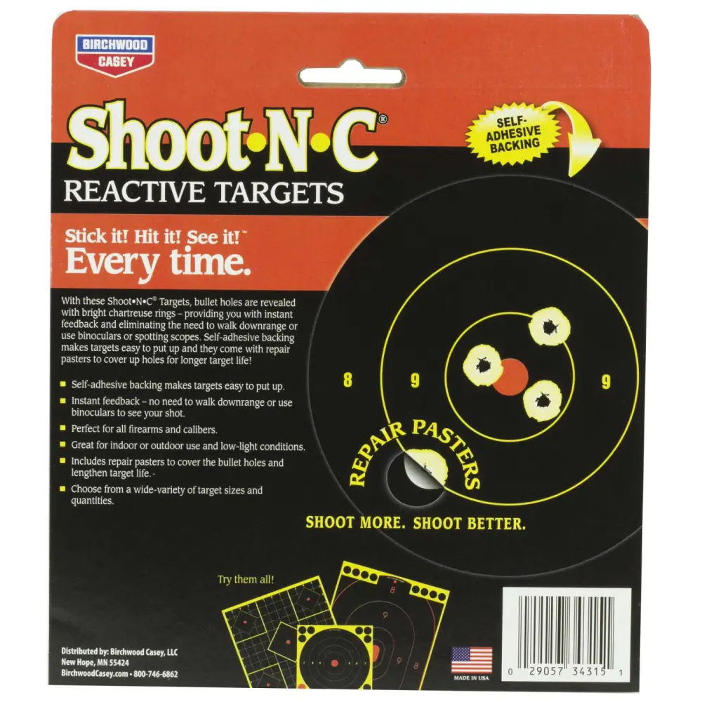 The Birchwood Shoot-N-C Bull's-Eye targets are great for close-range shooting with airguns and sharp shooting with .22 rimfire or centerfire guns. Bullet holes are easy to spot with bright chartreuse rings on these self-adhesive targets. You can design your own custom targets with these easy to place targets. Great for indoor or outdoor use and low-light conditions. Includes repair plasters to lengthen target life.