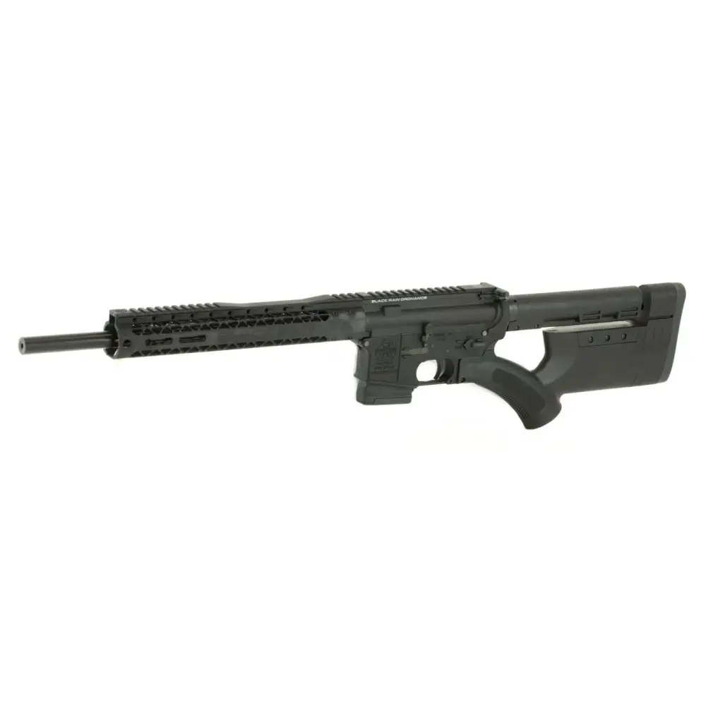 The Black Rain Ordnance Spec series is a line of AR15 rifles and pistols built to meet bid requirements for law enforcement and military personnel and as an affordable option for civilian use. The SPEC15 Carbine uses a direct impingement gas system, has a low profile adjustable gas block, and a Nickel Boron-coated BCG. It has a billet 7075 T6 aluminum upper and lower receiver, 4150 chormoly barrel and a 12" M-Lok hybrid handguard. This 5.56 model has crowned 16" barrel, Thordsen Customs "Featureless stock, and a black hardcoat anodized metal finish.