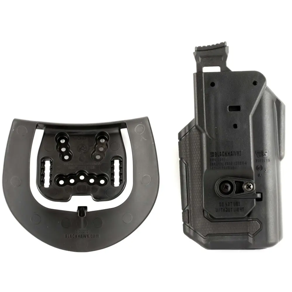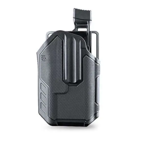 The Blackhawk Omnivore multi-fit family of holsters accommodates more than 150 styles of semi-automatic handguns. Its active retention mechanism locks onto a proprietary rail attachment device, and onto the SureFire X300/X300U-A models. The instinctive thumb release disengages the locking mechanism from the rail attachment device when drawing the handgun.