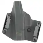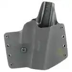 The Standard OWB is ideal for users who desire a rugged and rigid carry platform. It'a great for OWB concealment due to the side mounted belt attachment points, this reduces the overall thickness of the platform and allows the gun to ride as close to the body as possible. The Standard OWB holster is designed to have a total curve throughout the body of the holster, allowing the holster to have a more natural fit to the curve of the body. Additionally, the Standard OWB holster comes outfitted with a retention screw that allows the end user adjustability to the retention of the holster to their preference. Thread Locker is applied to all screws to prevent loosening over time. The metal OWB loops eliminates a common failure point (loops breaking). All OWB holsters can be converted to IWB by removing the OWB loops from the back of the holster and attaching IWB loops to the front of the holster. Made in the USA.