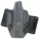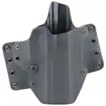 The thin mounting profile of the Leather Wing allows for OWB concealment. The Leather Wing was designed to retain the most popular features of a Kydex holster, while improving the fit and comfort of the holster to the body through the addition of leather wings. The belt loops of the holster are attached to these wings and the belt of the wearer then threads through the loops on the leather wings. This configuration allows for a much slimmer and more comfortable fit. A tension Screw allows for quick adjustment of holster retention within set range. Thread Locker is applied to all screws to prevent loosening over time. All OWB holsters can be converted to IWB by removing the OWB loops from the back of the holster and attaching IWB loops to the front of the holster. Made in the USA.