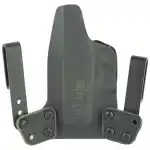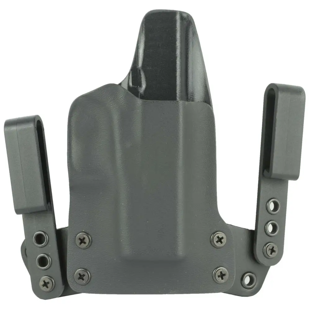 The Mini Wing is designed to be minimalistic. It uses as little material as possible, without sacrificing performance or durability. Dedicated to maintaining a thin profile, this holster allows for deep concealment matched with ultimate comfort. The pairing of Kydex and leather allows for the Kydex to reliably retain your pistol without a break in or wear out period. In addition, the Kydex shell prevents the holster from collapsing when your pistol is drawn, and remains open for easy one handed holstering. The leather mini wings are incorporated to allow the holster to wrap around the contours of your waist, allowing for a versatile fit for all body types. The mini wings give the holster flexibility to move with your body, making it comfortable for use all day, every day. The mini wings were constructed to provide the user with a variety of different configurations for IWB carry as well as a wind range of cant and ride height adjustments. This provides the user with a variety of available carry positions around the waist, from appendix, all the way to the small of the back. Thread Locker is applied to all screws to prevent loosening over time. Ride height and cant can be adjusted by changing the position of the IWB loops and wings. Made in the USA.